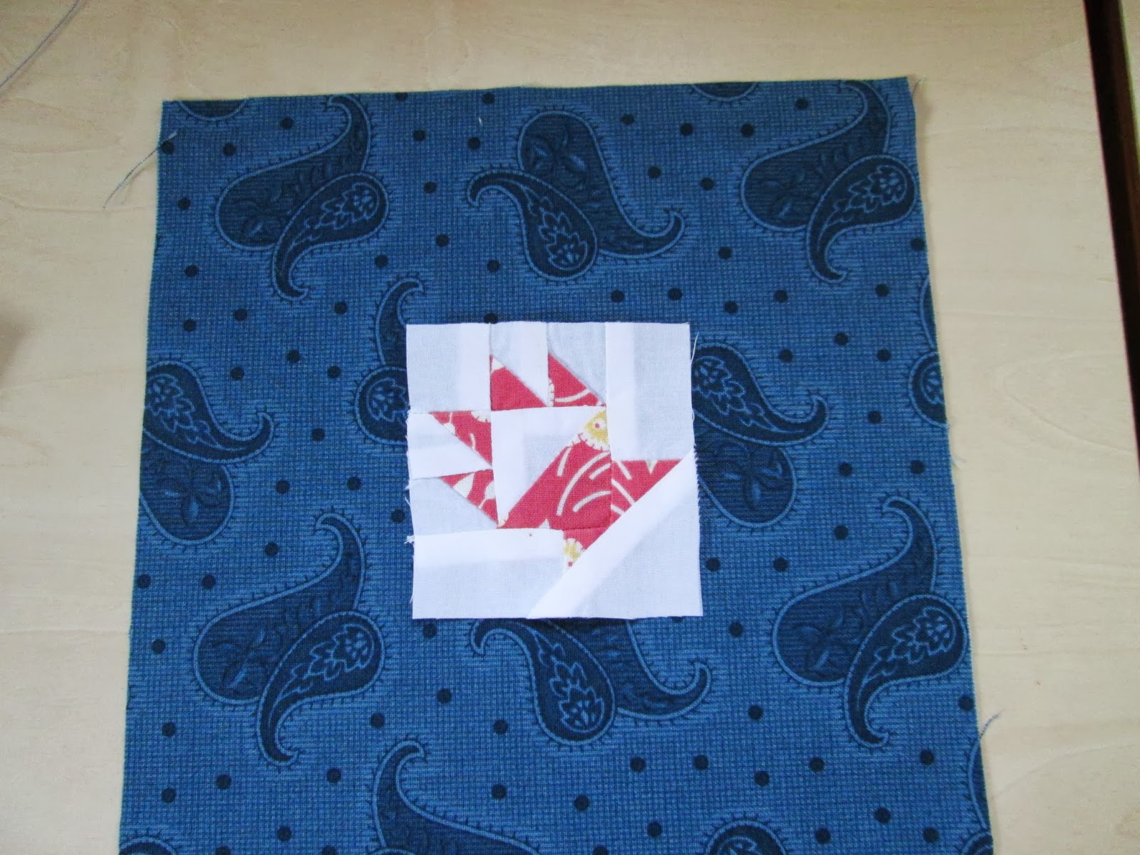 Now how small is small ? This is small by my standards, it is only 2.5" , this is set on a 7" sqaure I have cut for some pinwheel blocks I am making  so now you can compare sizes , small isn't it but it was indeed fun to make . I would say this would really be a great lesson in accuracy , not easy to hold these tiny pieces and sew straight .